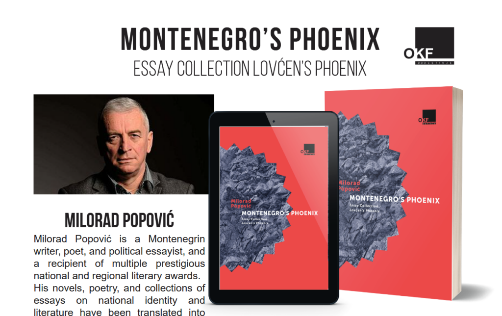 Zbirka eseja Lovćenski feniks Milorada Popovića, najvažnijeg crnogorskog pisca u ovom mileniju uz Andreja Nikolaidisa, prevedena je s crnogorskog na engleski jezik. U prevodu Gordane Simonović zove se Crnogorski feniks. I to je treće izdanje ove knjige, a drugo je objavljeno u Hrvatskoj i zove se Lovćenski feniks. Susjedi znaju gdje je Lovćen.