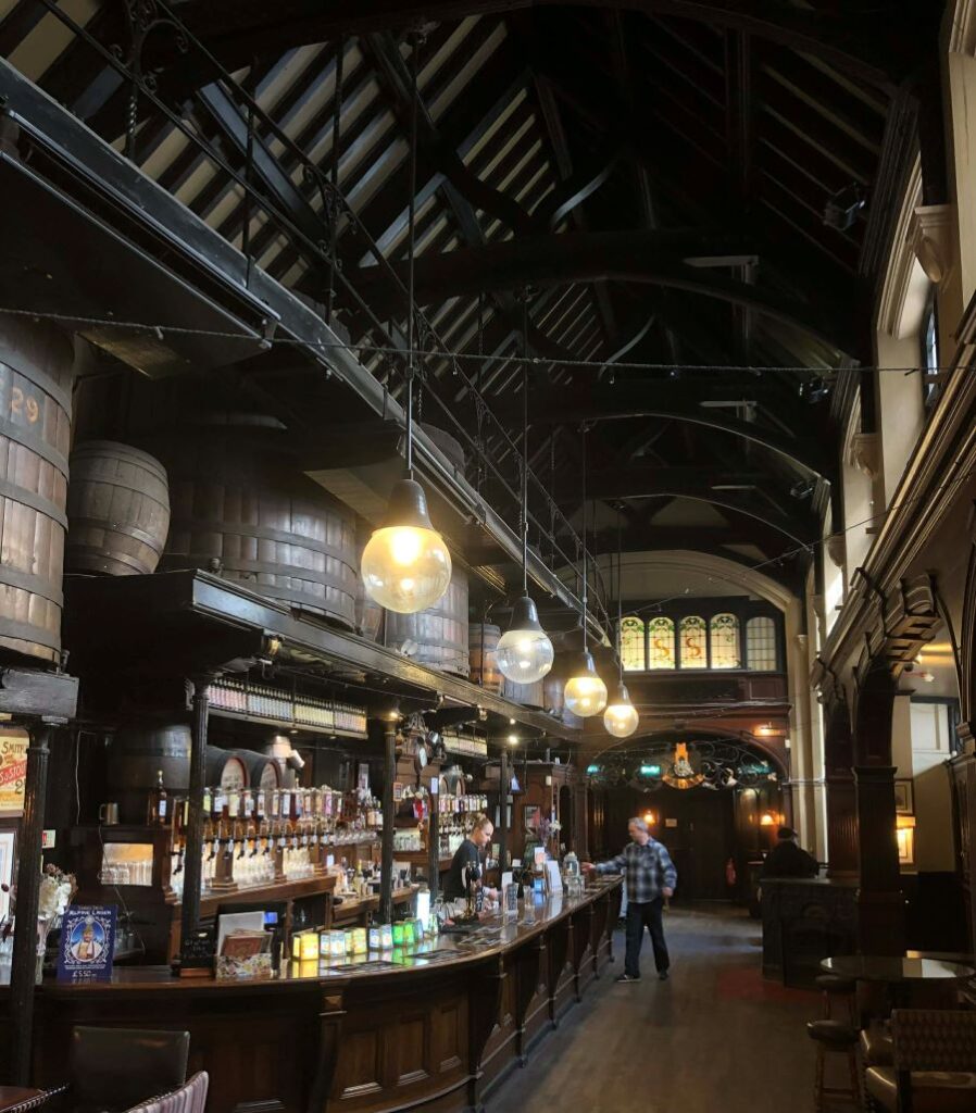 A onda se Cittie of Yorke otvara poput velike dvorane iz nekog drugog vremena. Prostran i odjekujući, iznenađuje osjetila. Dugi drveni bar proteže se pod visokim stropovima, a goleme bačve porta stoje uz zidove poput tihih stražara. U svemu tome ima nečeg teatralnog, gotovo snolikog, kao da ste zakoračili u poluzaboravljenu viziju srednjovjekovnog Londona. Prostranstvo zadivljuje, ali ne udaljava. Naprotiv, poziva da ostanete, da budete mali unutar nečeg velikog, da podijelite trenutak koji lebdi između stoljeća. Cittie of Yorke je možda vizualno najimpresivniji od ova tri navedena puba.