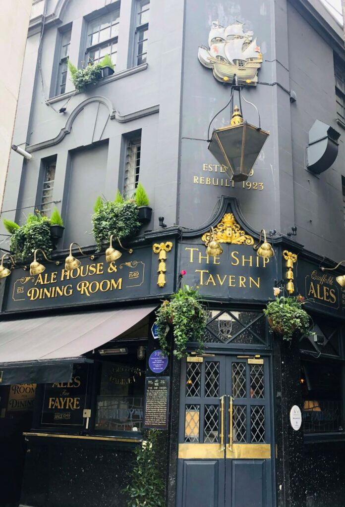 Na kratkoj udaljenosti, The Ship Tavern nudi drugačiji, ali jednako privlačan šarm. Njegovi korijeni sežu u 16. stoljeće (iako je kasnije obnavljan), a povezuje ga se s tajnim katoličkim misama tijekom reformacije, što njegovoj priči daje dodatnu dozu intrige. Za vrijeme vladavine kralja Edwarda VI., The Ship je služio kao „podzemna“ crkva za skrivene londonske katolike. Zabranjeni katolički svećenici vodili su misu s propovjedaonice, vješto prerušene u bar, dok su redari signalizirali prisutnost kraljevih dužnosnika, što je potaknulo njihovu transformaciju u bučnu klijentelu puba. Ovaj pub danas njeguje tradiciju kroz ugodan interijer obložen drvom i naglasak na zasitnoj britanskoj kuhinji. Gornje blagovaonice djeluju intimno i starinski, dok prizemni bar vrvi prijateljskom, susjedskom energijom. Upravo ta kombinacija moguće skrivene povijesti i iskrene gostoljubivosti čini The Ship Tavern mjestom koje je istovremeno bogato pričama i živahno.